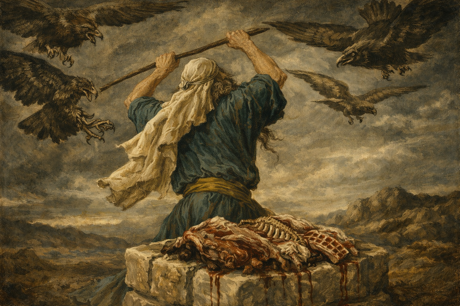 LEKH! LEKH! Abram swung his staff vigorously, yelling, “Lekh! Lekh!—Go! Go!” The vultures bounded back several yards, hopping with outspread wings. He turned back to the cutting Yahweh had bidden him to perform. There before him lay the bloody path between the split carcasses of a heifer, a female goat, a ram, and two birds. He had cut the animals in half, laying each side opposite the other, creating a pathway through death. Under the sweltering sun, much of the blood and offal had begun to congeal and the odor had already drawn a horde of flies, not so easily driven off as the vultures (though the vultures patiently lurched closer as soon as he turned his back).