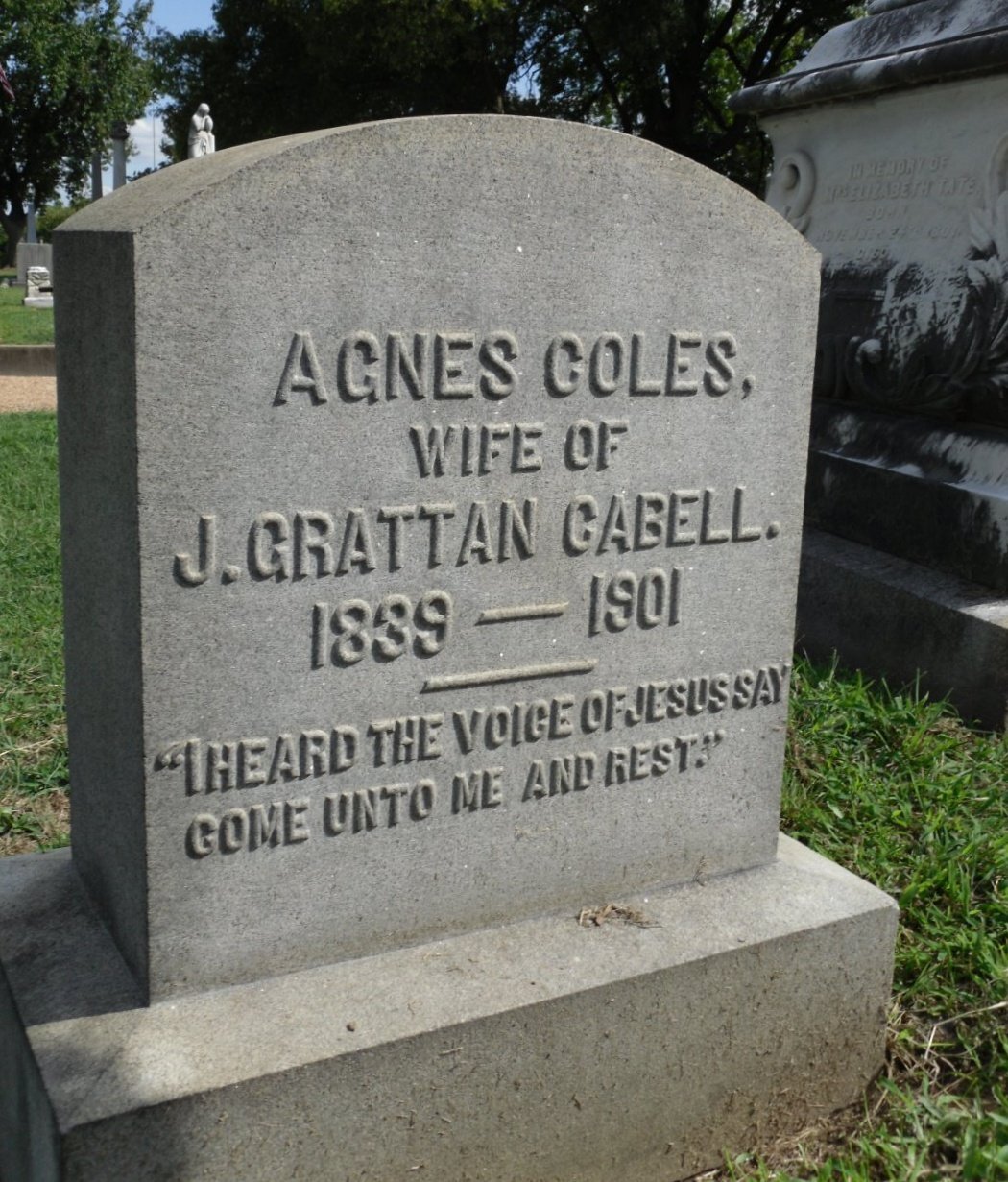 Agnes Coles Cabell is buried at Shockoe Hill Cemetery, Richmond, Virginia.