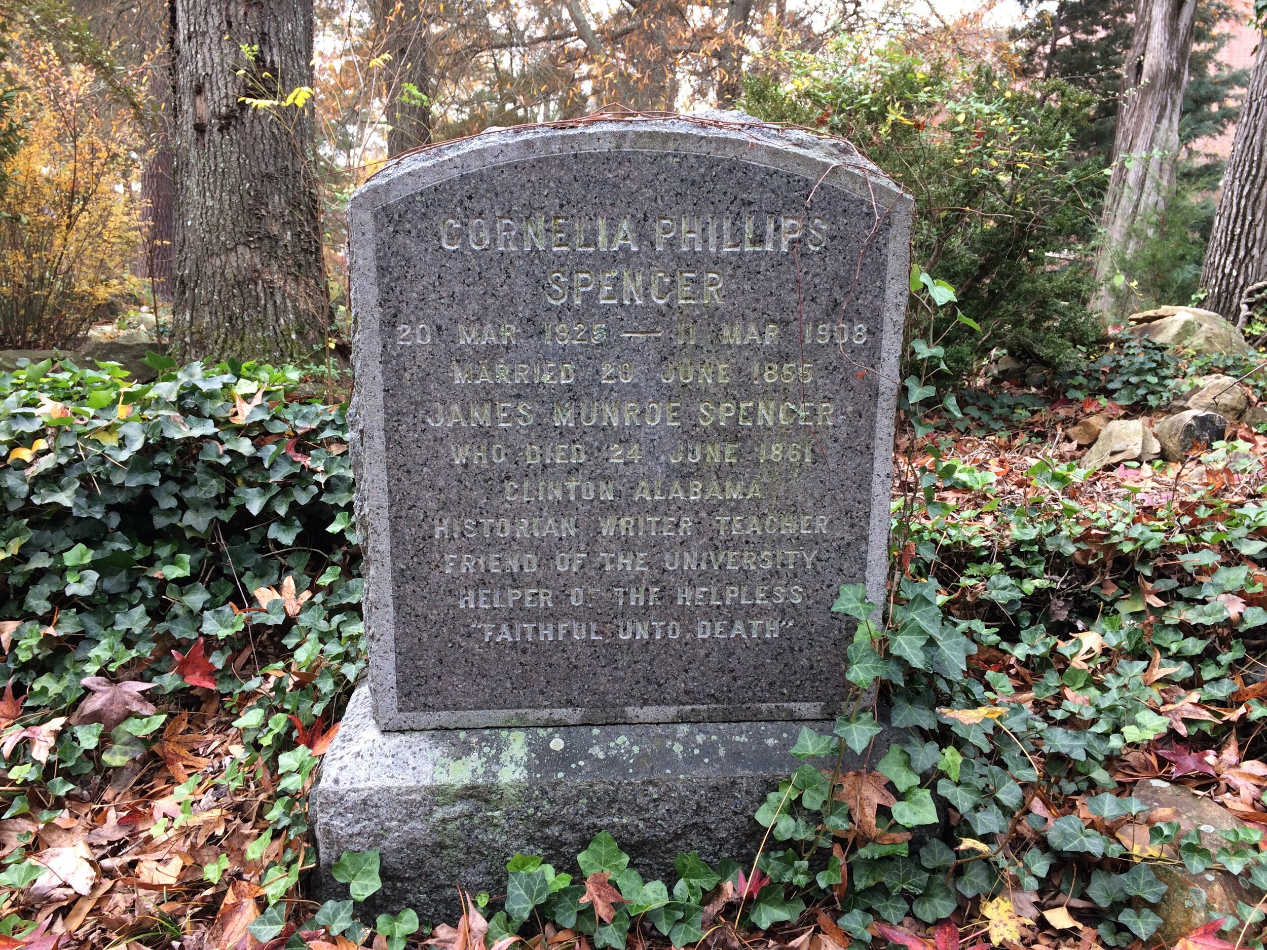 Cornelia Phillips Spencer is buried at the Old Chapel Hill Cemetery, Chapel Hill, North Carolina.