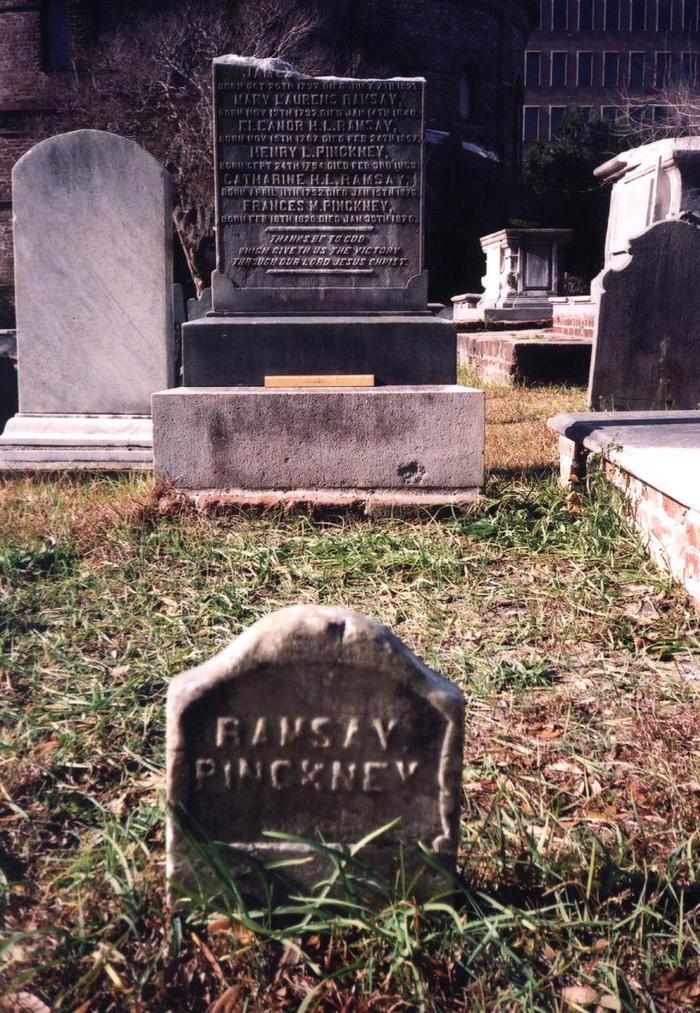 David Ramsay is buried at the Circular Congregational Church Burying Ground, Charleston, South Carolina. The top portion of the gravestone is broken off.