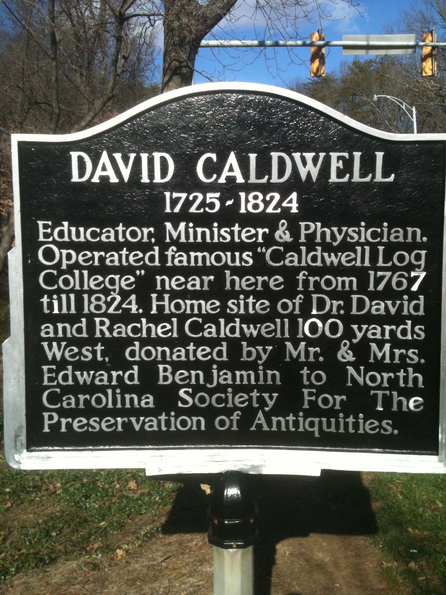 David Stewart Caldwell, Sr. is buried at Buffalo Presbyterian Church Cemetery, Greensboro, North Carolina.The David and Rachel Caldwell Historical Center, Greensboro, North Carolina.Historical marker at the David and Rachel Caldwell Historical Center, Greensboro, North Carolina.