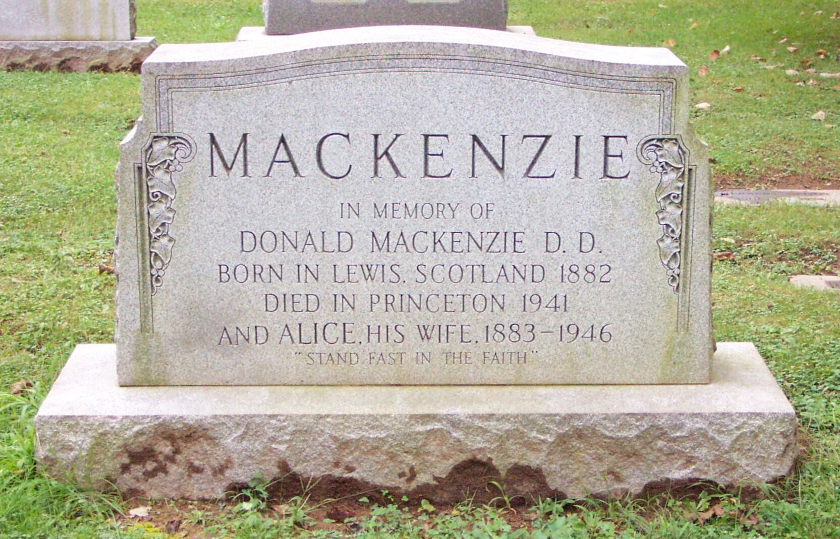 Donald Mackenzie is buried at Princeton Cemetery, Princeton, New Jersey.