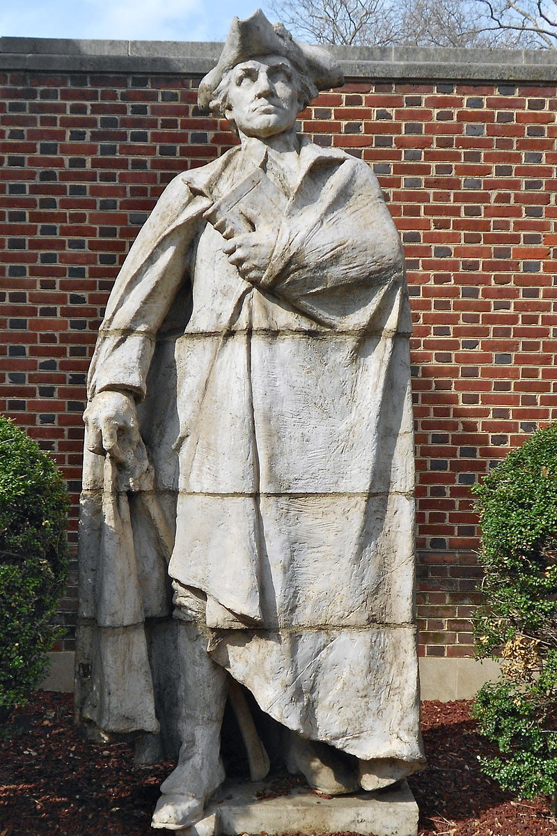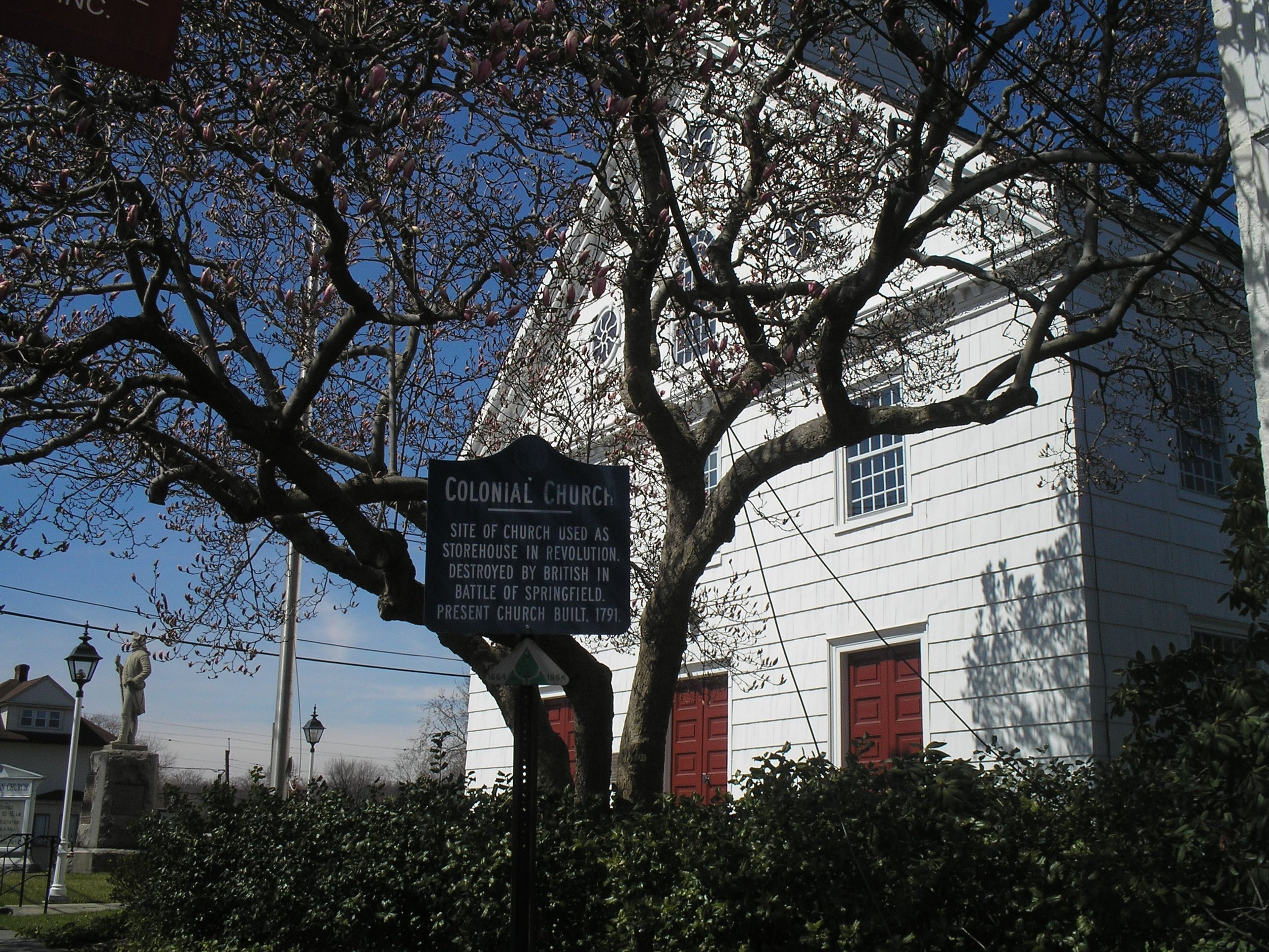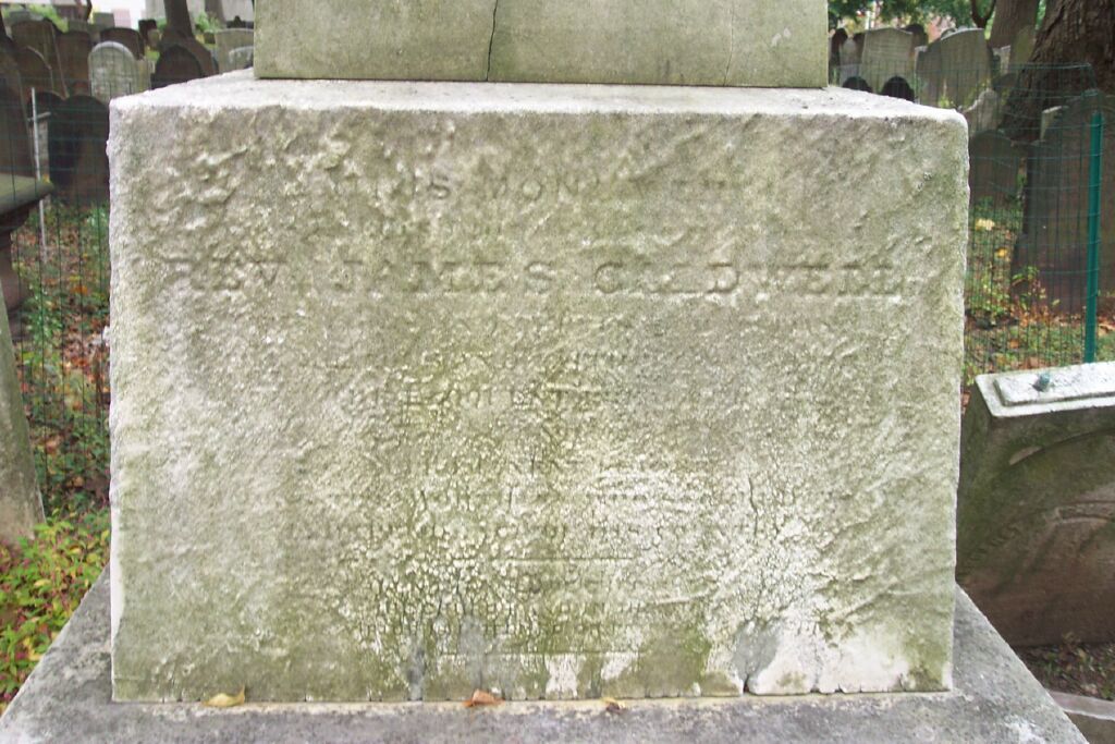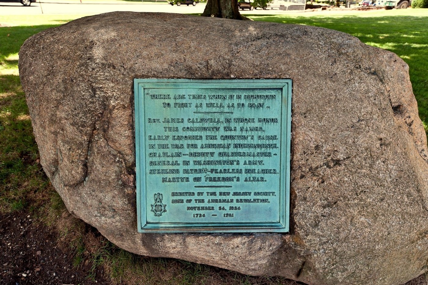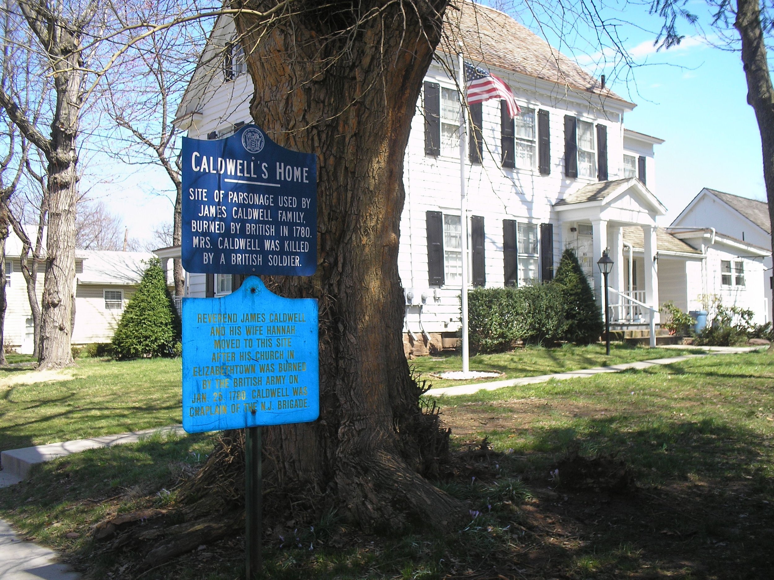 James Caldwell is buried at the First Presbyterian Churchyard, Elizabeth, New Jersey.Historical marker located in front of the First Presbyterian Church, Caldwell, New Jersey.The First Presbyterian Church of Springfield, New Jersey was organized in 1745. The congregation’s second meeting house was destroyed when the retreating British burned Springfield. When the Patriots were running short of gun wadding in the midst of the Battle of Springfield, June 23, 1780, Chaplain James Caldwell rushed into First Church to grasp an armful of Watts’ hymnals. He gave them to the American troops with the exhortation, “Put Watts into them, boys!” The present (third) building was erected in 1791.Old First Presbyterian Church of Elizabeth, New Jersey was organized about 1664. The edifice which stood on this spot was burned by the British on January 25, 1780, during the pastorate of Rev. James Caldwell. This building was completed in 1789.The James Caldwell house in Union, New Jersey.The James Caldwell statue by Alexander Stirling Calder, located at the Presbyterian Historical Society, Philadelphia, Pennsylvania.