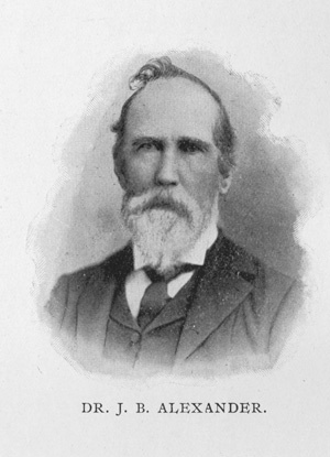 John Brevard Alexander (May 27, 1834 – June 24, 1911) was a distinguished physician, historian, and Presbyterian churchman born in Lemley’s Township, Mecklenburg County, North Carolina, of Scots-Irish descent. After graduating with high honors from Davidson College and the Medical College of South Carolina, he served as a surgeon in the Civil War and then practiced medicine in his home county, where he also wrote important local histories including The History of Mecklenburg County from 1740 to 1900. He was a long-time elder of Bethel Presbyterian Church, an active member of First Presbyterian Church in Charlotte later in life, and authored several works on early settlers and church history before his death and burial in Elmwood Cemetery.