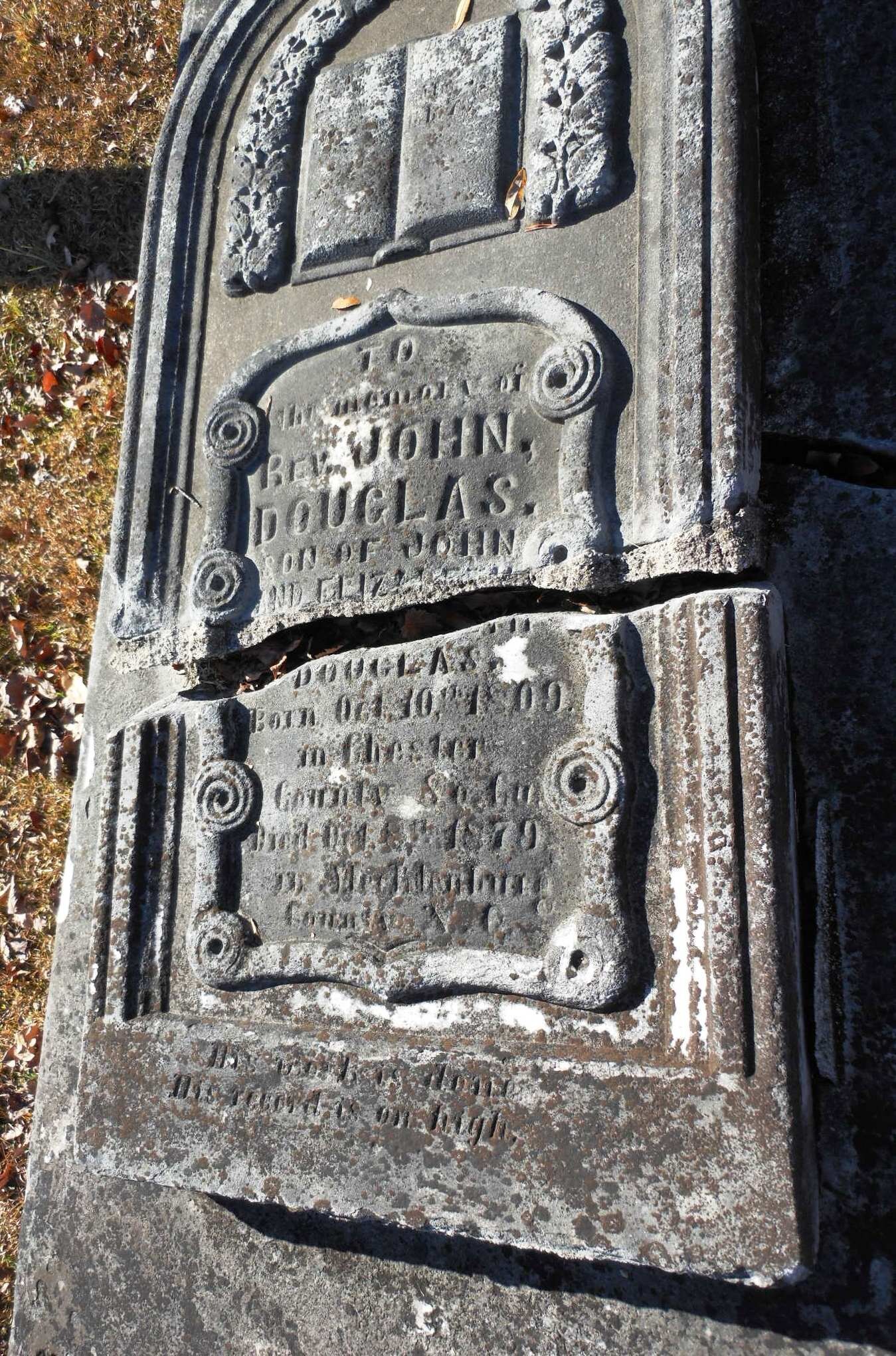 John Douglas is buried at Steele Creek Presbyterian Church Cemetery, Charlotte, North Carolina.