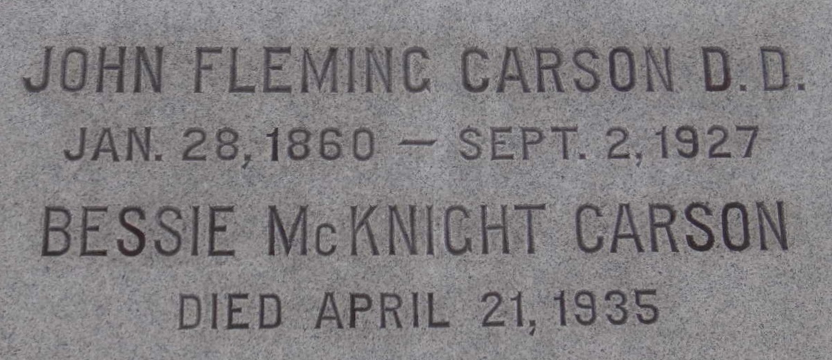 John Fleming Carson is buried at West Laurel Hill Cemetery, Bala Cynwyd, Pennsylvania.