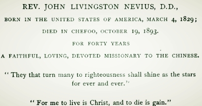 John Livingston Nevius is buried at Chefoo Temple Hill Cemetery, Yantai, Shandong, China.