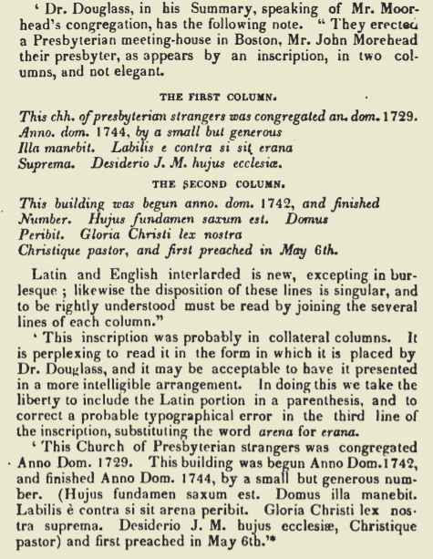 Source: Caleb Hopkins Snow,A History of Boston, p. 222 (1828 ed.).The Long Lane Meeting House in Boston, Massachusetts was built in 1744. This is where the Rev. John Moorhead ministered to the “Church of the Presbyterian Strangers.” It transitioned to Congregationalism in 1786, and later became Unitarian. It has also been known as the Federal Street Church, but continues today as the Arlington Street Church. There were columns in the 1744 structure as noted below.