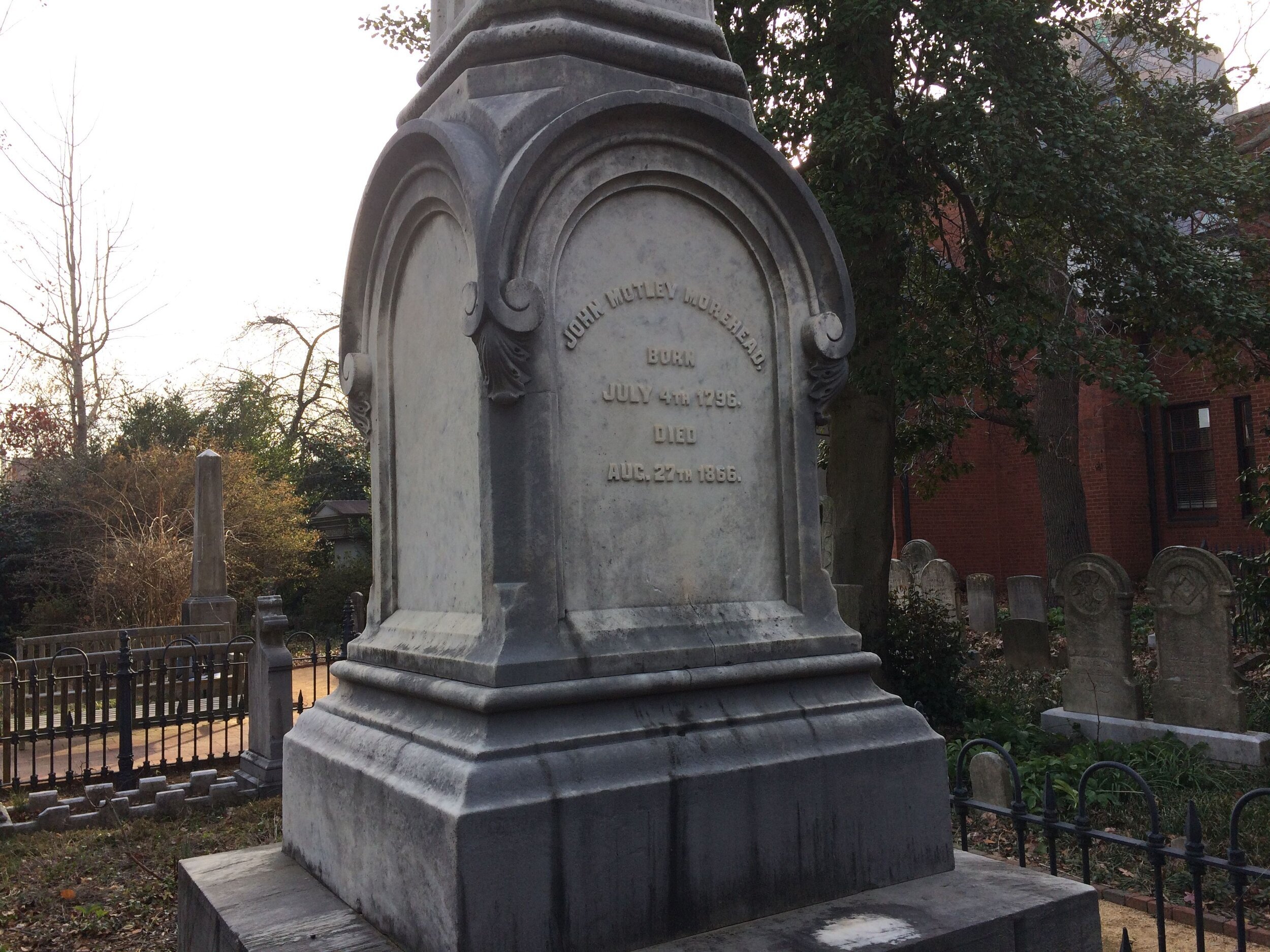 John Motley Morehead is buried at the First Presbyterian Church Cemetery, Greensboro, North Carolina.