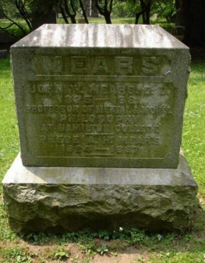 John William Mears is buried at Hamilton College Cemetery, Clinton, New York.
