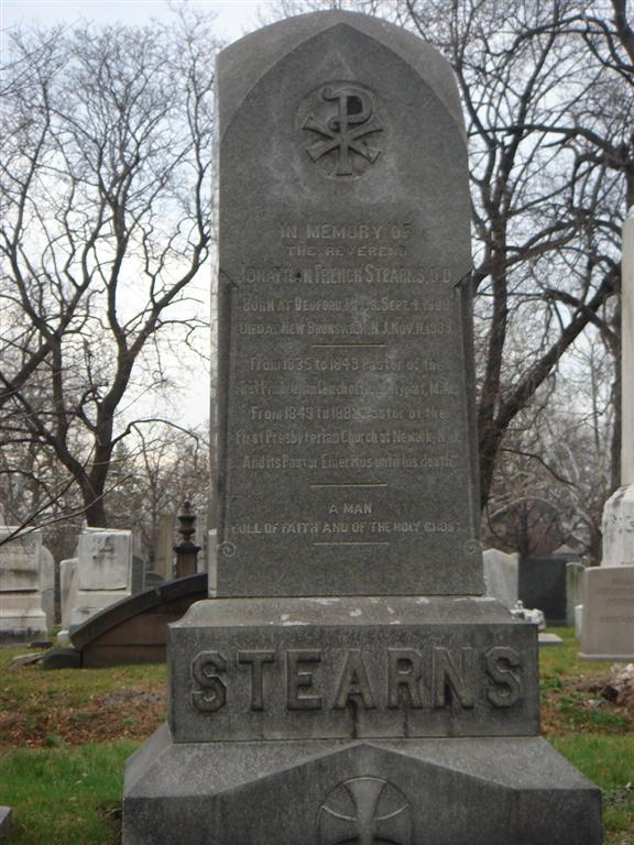 Jonathan French Stearns is buried at Mount Pleasant Cemetery, Newark, New Jersey.