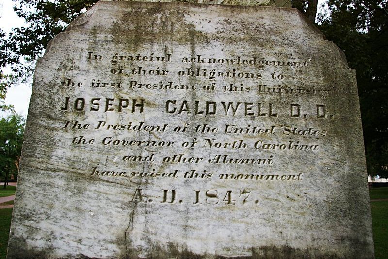 Joseph Caldwell is buried at the Old Chapel Hill Cemetery, Chapel Hill, North Carolina.The Joseph Caldwell monument is located on the campus of the University of North Carolina-Chapel Hill, Chapel Hill, North Carolina.Books and spectacles owned by Joseph Caldwell.