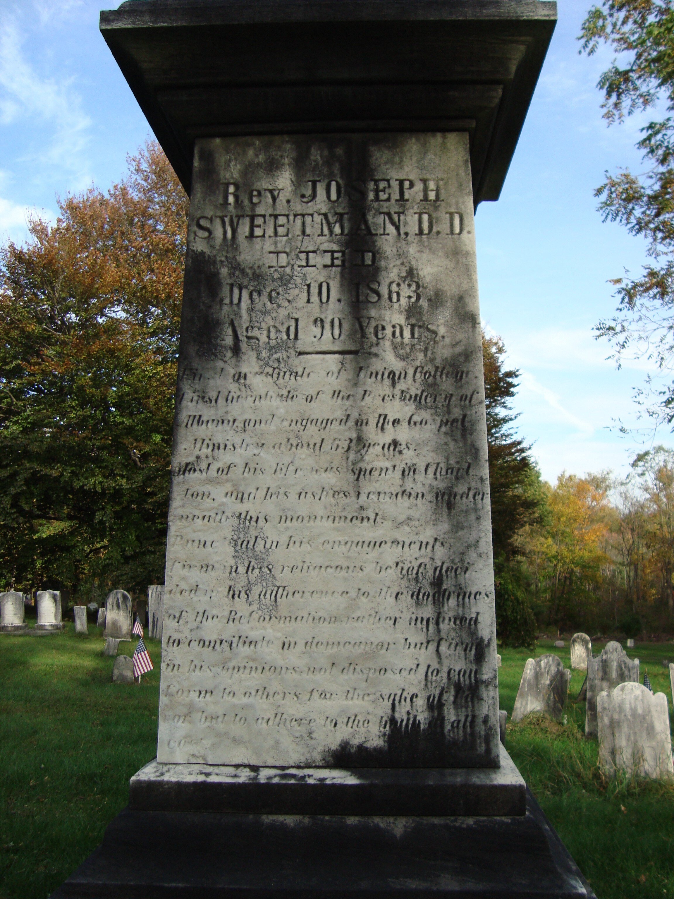 Joseph Sweetman is buried at Sweetman Cemetery, Charlton, New York.