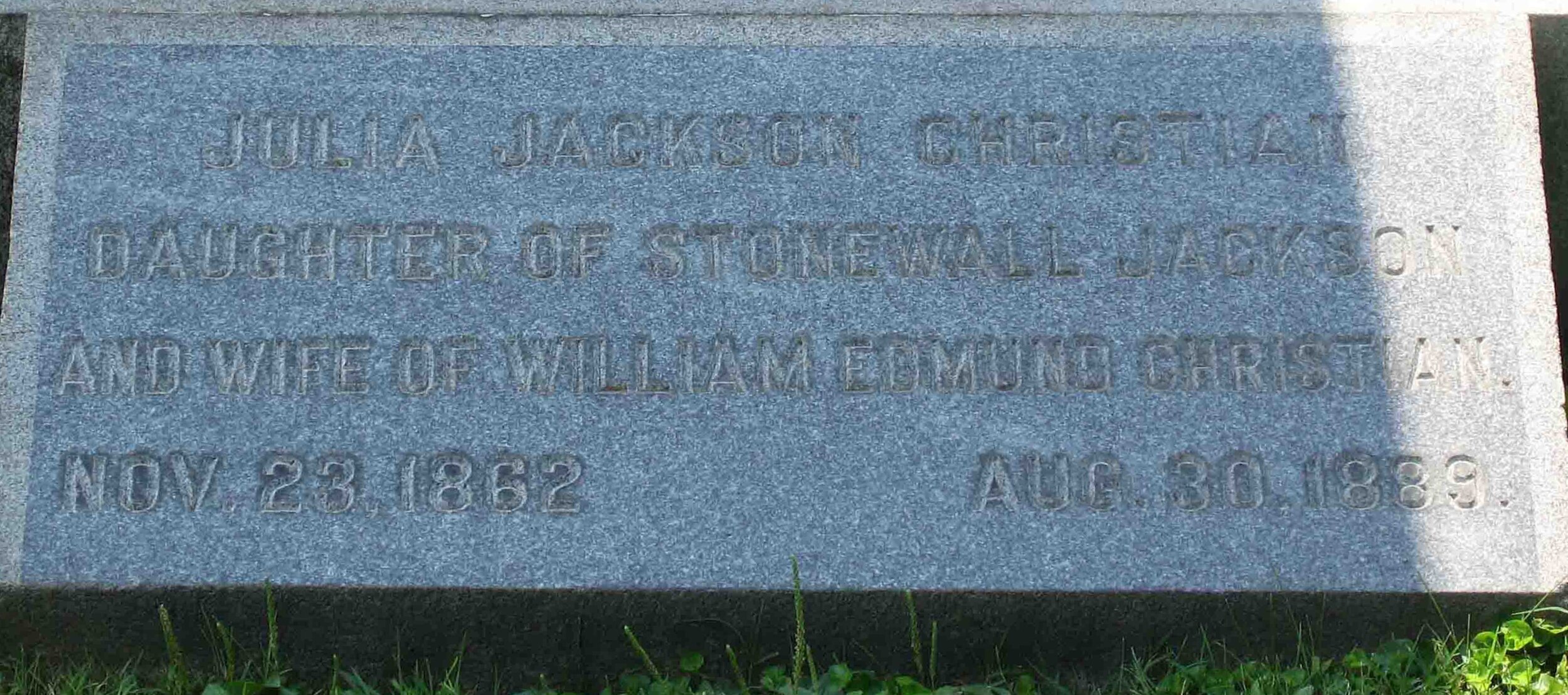 Julia Thomas Jackson Christian is buried at the Stonewall Jackson Memorial Cemetery, Lexington, Virginia.