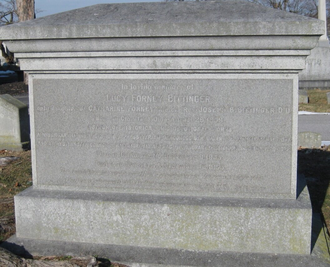 Lucy Forney Bittinger is buried at Mount Olivet Cemetery, Hanover, Pennsylvania.
