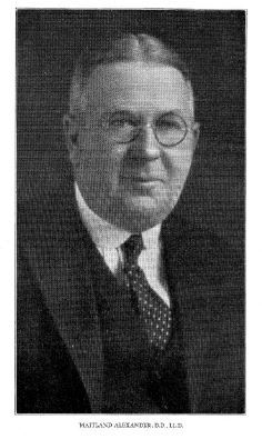 Maitland Alexander (1867–1940) was an American Presbyterian minister and church leader who served as the long-time pastor of First Presbyterian Church in Pittsburgh, Pennsylvania from 1899 to 1929 and became one of the denomination’s prominent clerical figures in the early 20th century. He was born on April 8, 1867, graduated from Princeton University (then the College of New Jersey) and Princeton Theological Seminary, was ordained in 1892, and held earlier pastorates in Long Branch, New Jersey, and Harlem, New York, before his Pittsburgh tenure; he also served as Moderator of the General Assembly of the Presbyterian Church in 1914 and spent a year (1918) as Director of Religious Work for the American occupation army in Germany during World War I. After retiring in 1929, he was pastor emeritus until his death on January 3, 1940; his sermons and addresses from 1898–1927 are preserved in the Maitland Alexander Manuscript Collection at Princeton Theological Seminary.