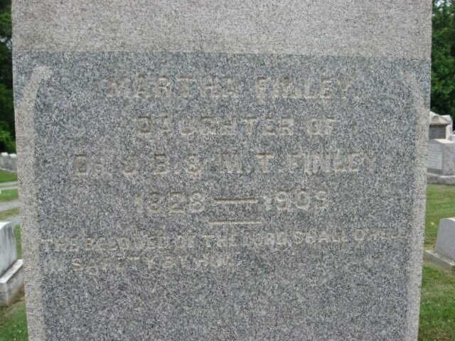 Martha Farquharson Finley is buried at Elkton Cemetery, Elkton, Maryland.