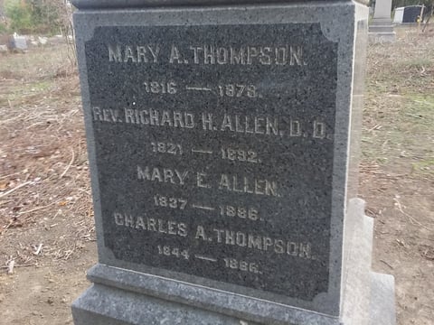 Richard Howe Allen, D.D. (1821–1892) was a Presbyterian minister and author in 19th-century Philadelphia best known for editing and publishing Leaves From a Century Plant, the official report of the centennial celebration of the Old Pine Street Church (Third Presbyterian Church) in 1868. In that work he helped preserve speeches, historical addresses, and documents related to the church’s first hundred years and its role in Presbyterian life in the city. Allen is buried at Mount Moriah Cemetery in Philadelphia, Pennsylvania, reflecting his long association with the city’s ecclesiastical community.