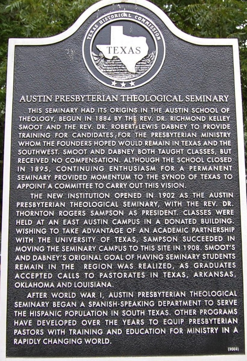 Historical marker located at the Austin Presbyterian Theological Seminary in Austin, Texas.