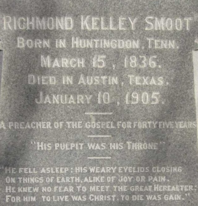 Richmond Kelley Smoot is buried at Oakwood Cemetery, Austin, Texas.