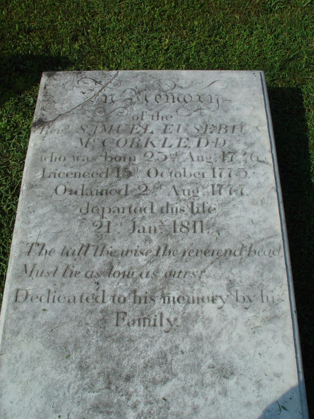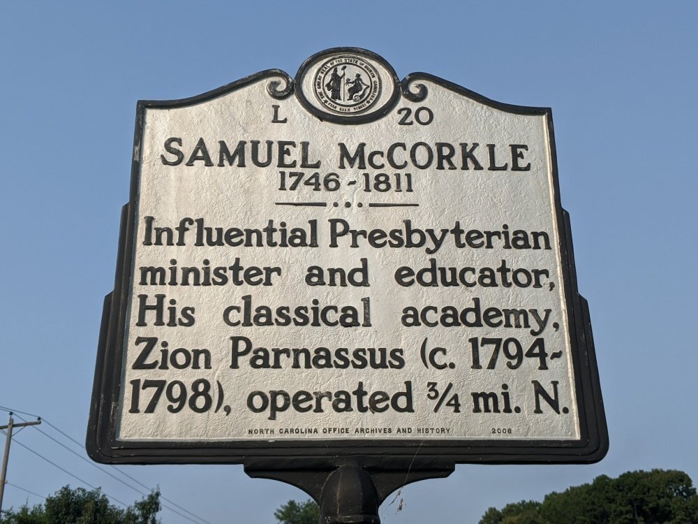 Samuel Eusebius McCorkle is buried at Thyatira Presbyterian Church Cemetery, Mill Bridge, North Carolina.McCorkle Place on the campus of the University of North Carolina at Chapel Hill is named for Samuel Eusebius McCorkle.Thyatira Presbyterian Church in Salisbury, North Carolina, where Samuel Eusebius McCorkle served as pastor.Historical marker located in Salisbury, North Carolina.