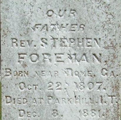 Stephen Foreman is buried at Park Hill Cemetery, Park Hill, Oklahoma.