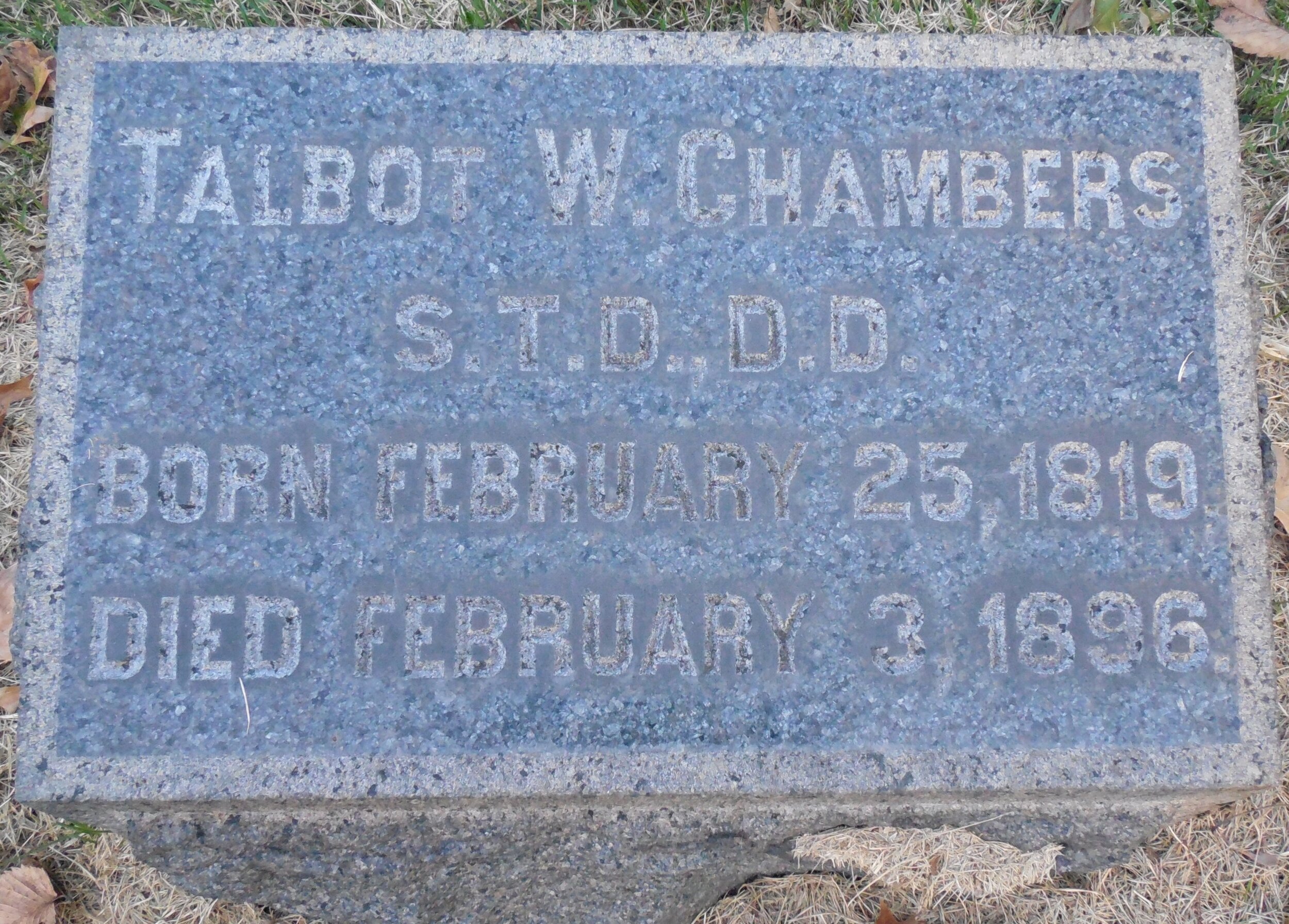 Talbot Wilson Chambers is buried at Old Somerville Cemetery, Somerville, New Jersey.