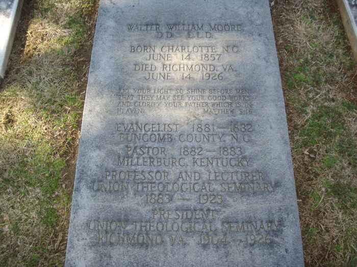 Walter William Moore is buried at Salem Cemetery, Winston-Salem, North Carolina.Walter William Moore served as both a professor and President at Union Seminary and was influential in its move from Hampden-Sydney, Virginia to Richmond, Virginia (photo credit: R. Andrew Myers).