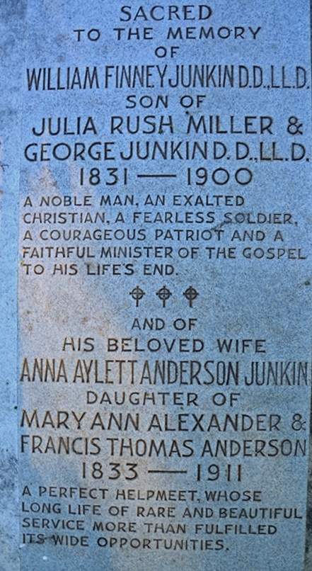 William Finney Junkin is buried at Stonewall Jackson Memorial Cemetery, Lexington, Virginia.
