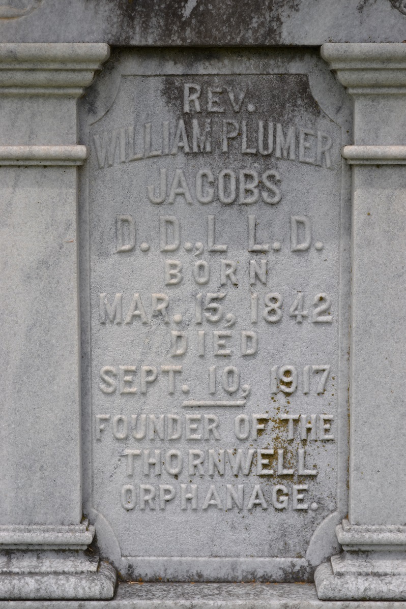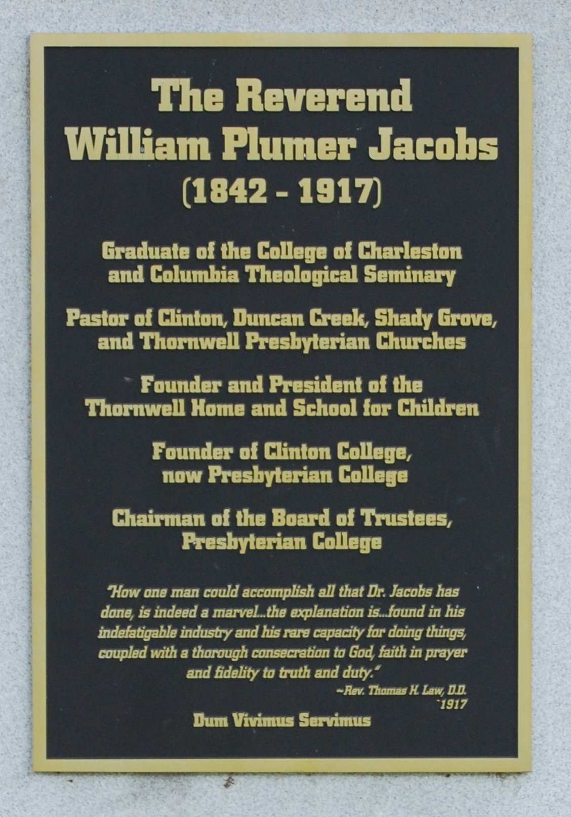 William Plumer Jacobs is buried at Clinton Cemetery, Clinton, South Carolina.Monument to William Plumer Jacobs at Thornwell Orphanage.This memorial plaque is located in Clinton, South Carolina.The William Plumer Jacobs sculpture is located in Clinton, South Carolina.