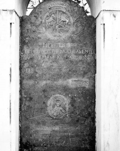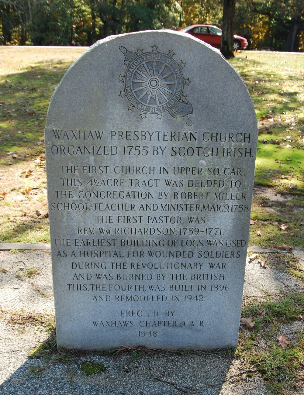 The obverse of his tombstone notes the funds he bequeathed to purchase religious books for the poor.William Richardson is buried at the Old Waxhaw Presbyterian Church Cemetery, Riverside, South Carolina.Historical marker for the Waxhaw Presbyterian Church. William Richardson served as its first pastor from 1759 to 1771.