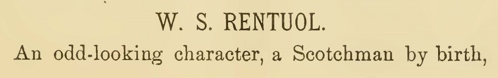 Rentoul’s Library of Standard Bible Expositions includes:1. Ralph Wardlaw,Lectures: Expository and Practical, on the Book of Ecclesiastes(1868)2. Alexander Moody Stuart,The Song of Songs: An Exposition of the Song of Solomon(1869)3. George Lawson,Practical Expositions of the Whole Books of Ruth and Esther(1870)“W.S. [Rentoul]. An odd-looking character, a Scotchman by birth, and a good type of the old curiosity monger. He is lean and lanky in personal appearance, and always very frowsy-looking about the head. He has a fine collection of old Presbyterian books, and is located in the second story on Sixth street above Market. I understand he came here from Pittsburgh. He has been in this city selling old Presbyterian books for over thirty years, but is known only by that class of book-buyers. He is of the old blue-stocking type, which is now becoming rare. I presume that from his long experience he know every book of note in the literature he sells, from John Knox to the Old Covenanters of to-day. He is known to few collectors of books, as he deals only in those mentioned.” — W. Brotherhead,Forty Years Among the Old Booksellers of Philadelphia, With Bibliographical Remarks(1891), pp. 57-58