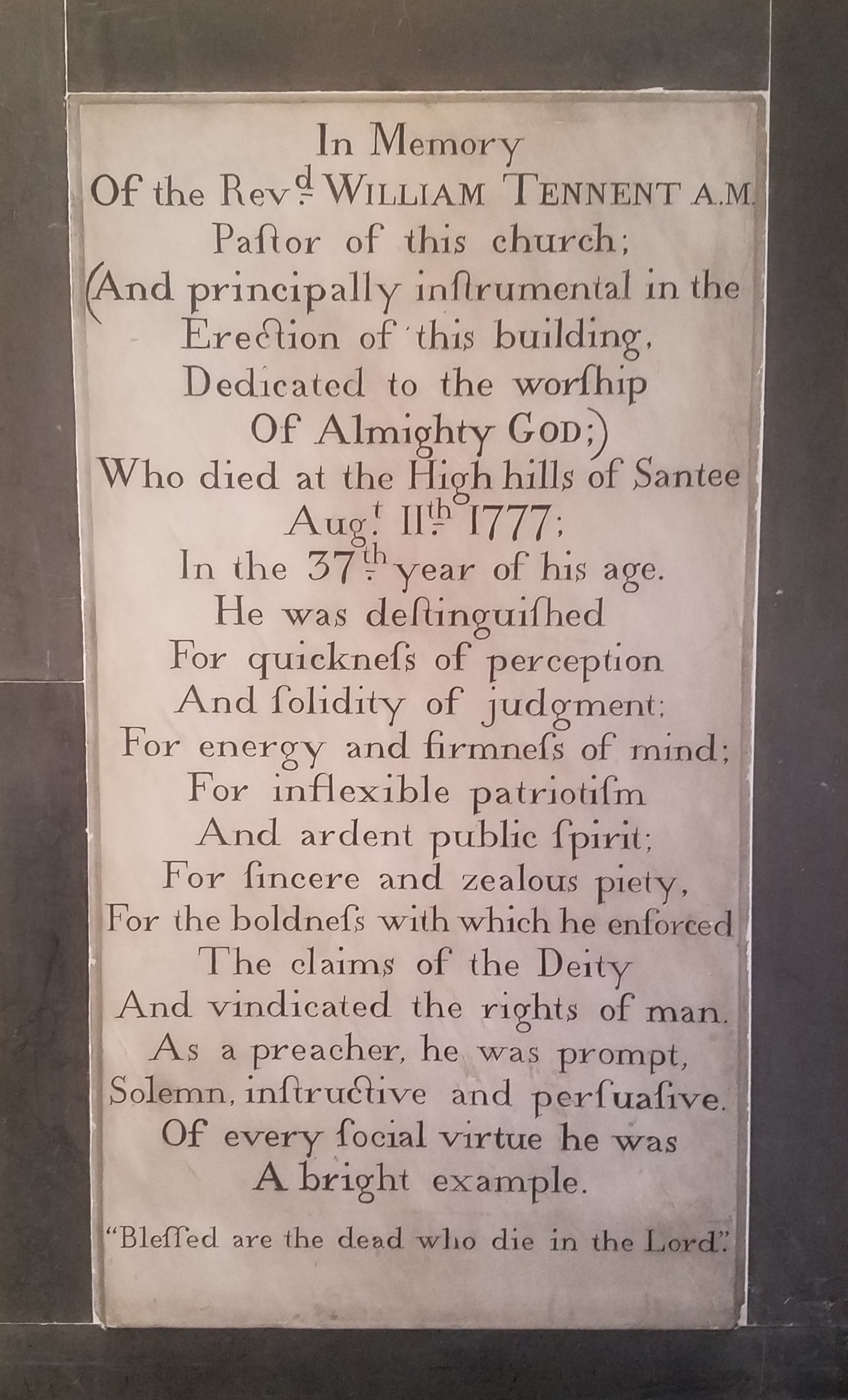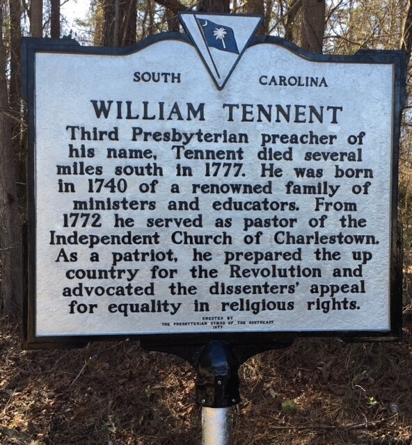 William Tennent, III is honored with this plaque at the Unitarian Church Cemetery, Charleston, South Carolina, where his wife is buried.. This church was originally an adjunct meeting house to the Independent, or Circular, Church, and became Unitarian in the 1830’s. Tennent himself is buried in an unmarked grave at Singleton’s Graveyard, near Wedgefield, South Carolina. (Photo credit: R. Andrew Myers)The William Tennent III historical marker is located in Stateburg, South Carolina.