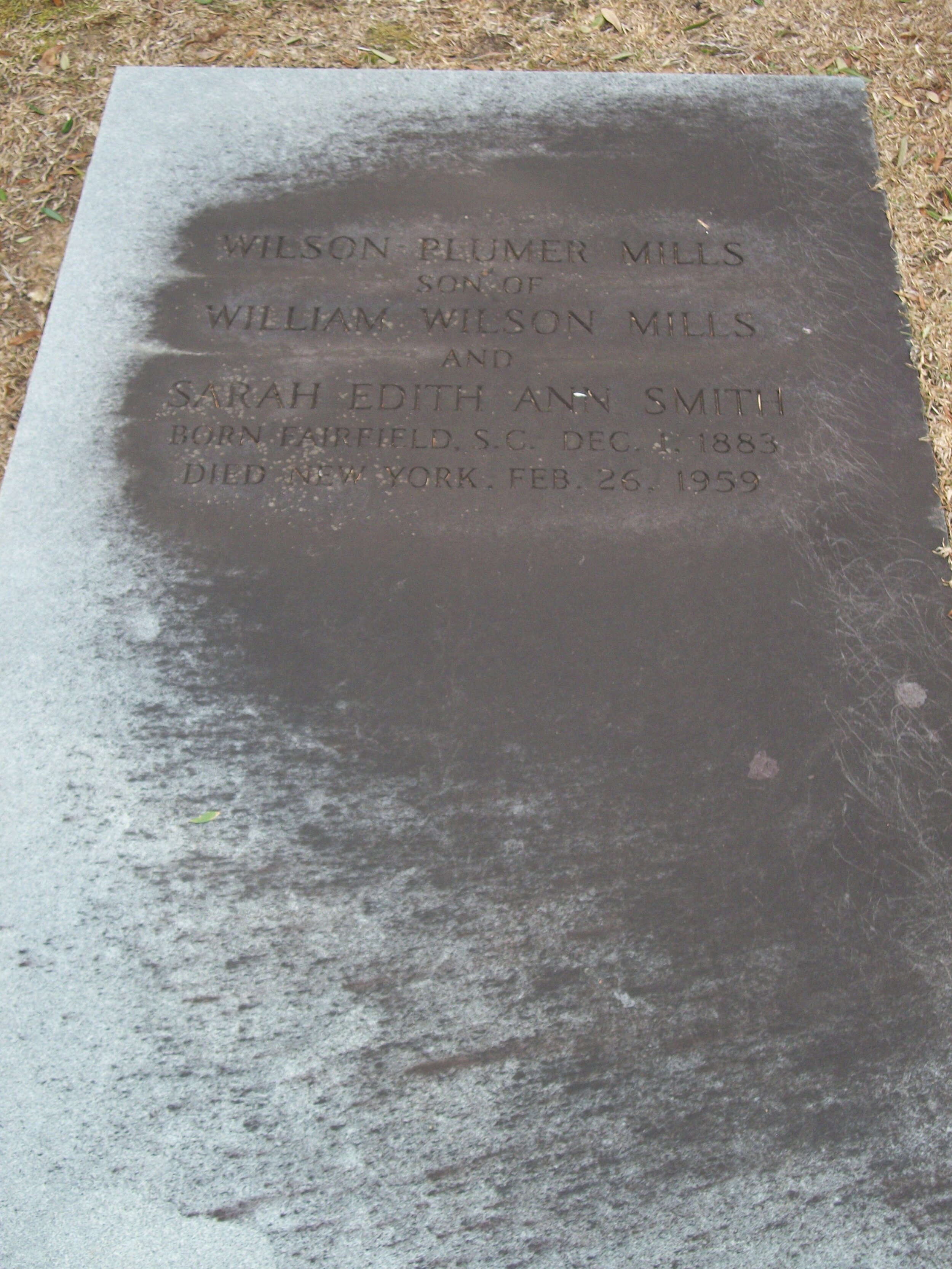 Wilson Plumer Mills is buried at Quaker Cemetery, Camden, South Carolina.